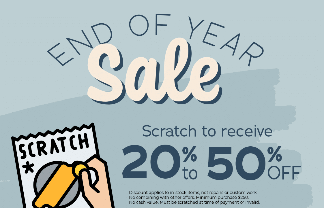 Discount applies to in-stock items, not repairs or custom work. No combining with other offers. Minimum purchase $250. No cash value. Must be scratched at time of payment or invalid.