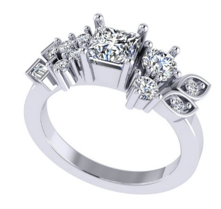 We show our clients the filled in view from a few different angles. At this stage the client can make many changes quite easily. For this ring, we added a couple baguette diamonds and did not use all of the diamonds from the old rings as some of them were very low quality and poorly cut.