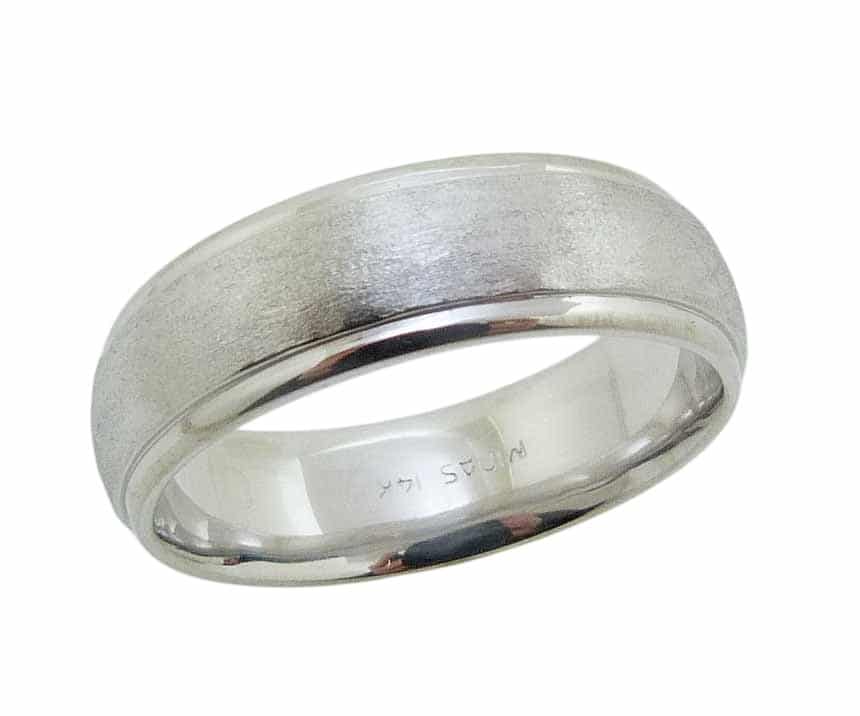 14K White gold domed men’s 7mm band with stainless hammer textured centre and polished step down edges.