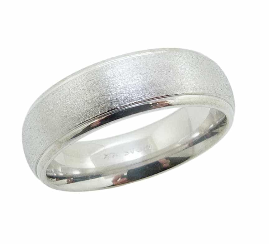 14K White gold domed men’s 6.5 mm band with mezzy texture centre and step down polished edges.