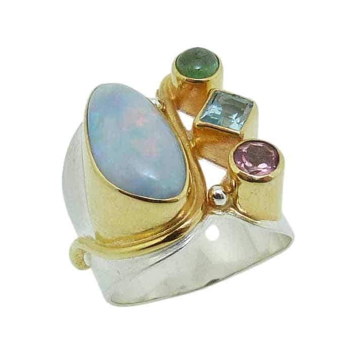 Sterling silver ring bezel set with kyanite, opal, pink tourmaline, and topaz and is accented with 22 karat yellow gold vermeil. This ring is part of the Michou Collection.