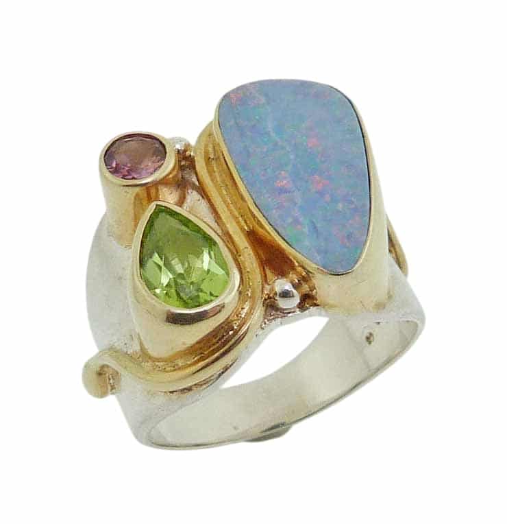 Sterling silver ring bezel set with an opal, peridot, and pink tourmaline and is accented with 22 karat yellow gold vermeil. This ring is part of the Michou Collection.
