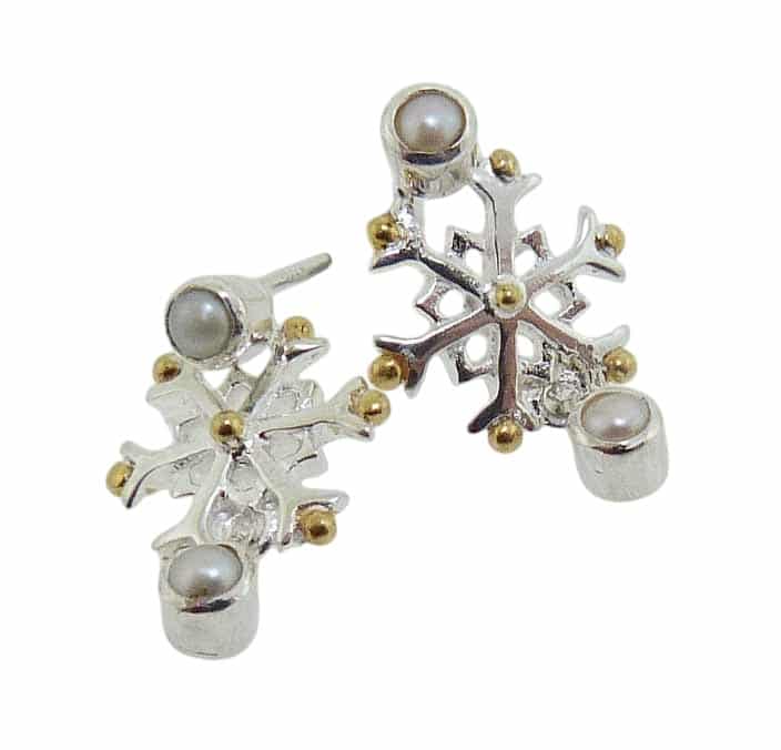 Sterling silver & 22K vermeil snowflake dangle earrings with white freshwater pearls.