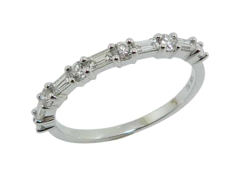 14K White gold diamond wedding band claw set with 5 baguette diamonds, 0.20 total carat weight, and six round brilliant cut diamonds, 0.23 total carat weight.