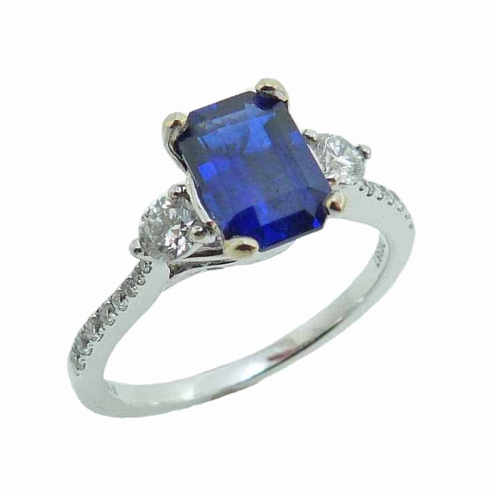 18K White gold ring claw set in the centre with a 1.45 carat emerald cut blue sapphire and accented with twenty excellent-very good cut, round brilliant cut diamonds totaling 0.38 carats, G-H VS-SI.
