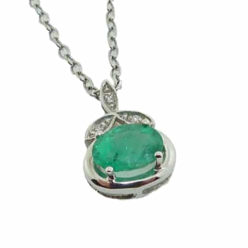 14K White gold lady’s pendant claw set with a 0.84 carat oval emerald & accented on the bale with 3 bead set round brilliant cut diamonds, 0.02 total carat weight.