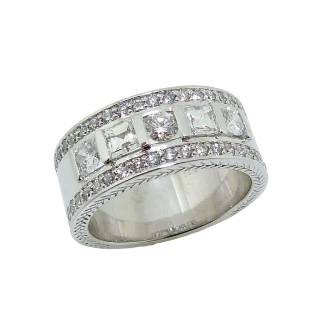 14K White gold lady’s diamond ring, bar-set down the centre with 2 carre diamonds totaling 0.39 carats, F-G, VS1-2 and 3 excellent-very good round brilliant cut diamonds totaling 0.366 carat, F-G, VS2-SI1. Accented along each side with fifty very good cut round brilliant cut diamonds totaling 0.59 carats, G, VS.