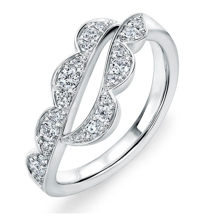18K White gold Lorelei Double Ribbon Band pave set with 23 ideal, round brilliant cut diamonds, 0.35 total carat weight, G/H, VS-SI.