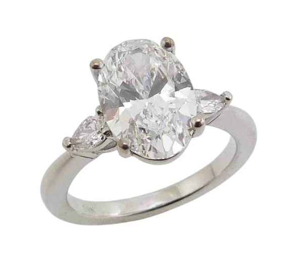 14K White gold three stone engagement ring claw set in the centre with a 2.02 carat, D, VVS2 oval brilliant cut lab grown diamond and two pear brilliant cut lab grown diamonds, 0.19 total carat weight, F/G, VS.
