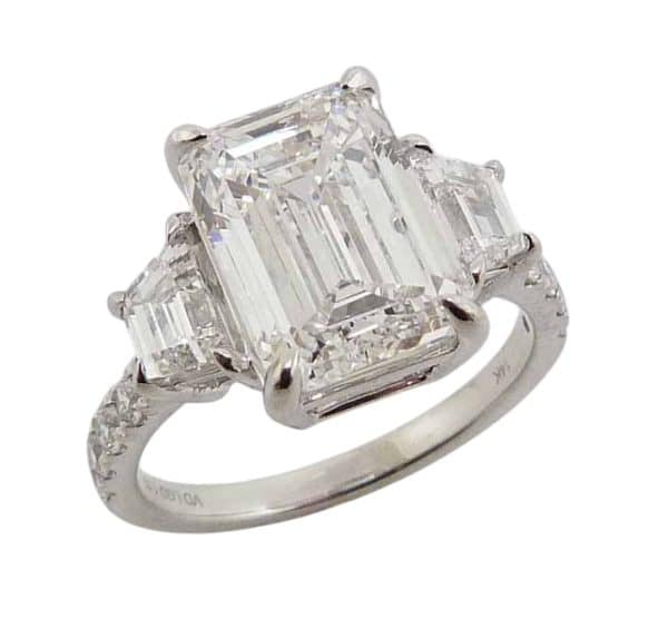 14K White gold three stone engagement ring claw set with a 5.05 carat radiant cut lab grown diamond, E, VS1, and channel set with four baguette lab grown diamonds, 0.74 total carat weight, F/G, VS and claw set with eight round brilliant cut lab grown diamonds, 0.64 total carat weight, F/G, VS.