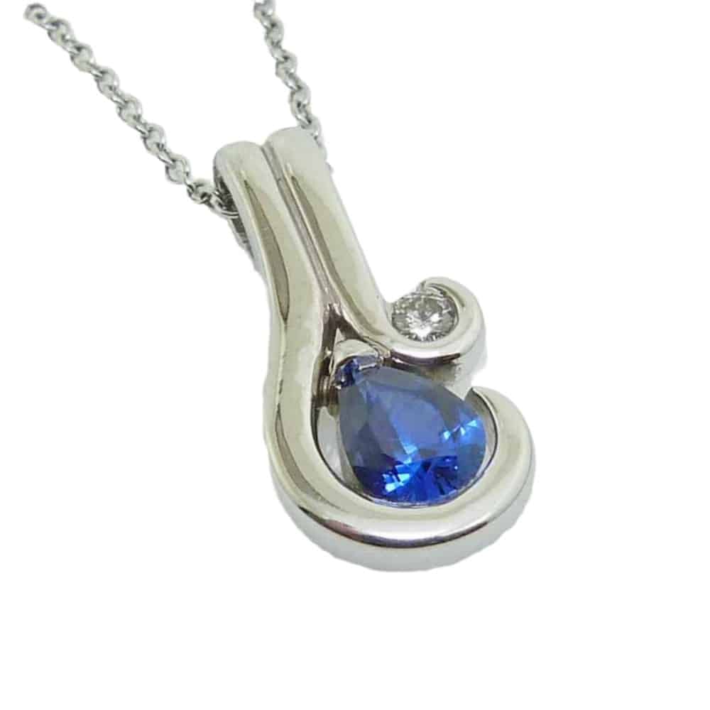 14K White gold custom pendant set with a 1.01 carat pear shaped blue sapphire and accented with a 0.082 carat natural round brilliant cut diamond, G-H, SI1.
