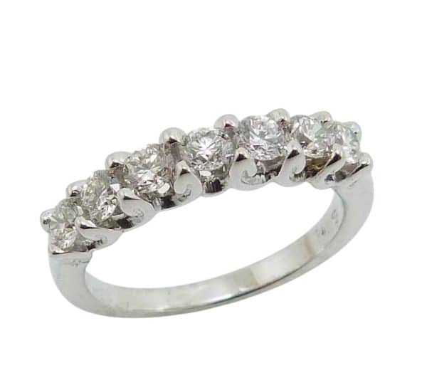 14K White gold lady’s band claw set with seven natural round brilliant cut diamonds, 0.691 total carat weight, G/H, SI.