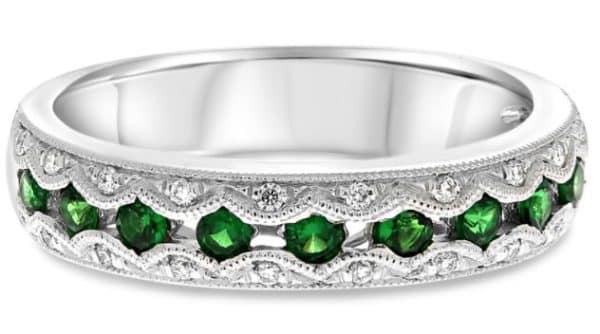 14K White gold lady’s ring pave set along each edge with twenty-two round brilliant cut diamonds, 0.09 total carat weight, and channel set in the centre with ten tsavorite garnets, 0.41 total carat weight.