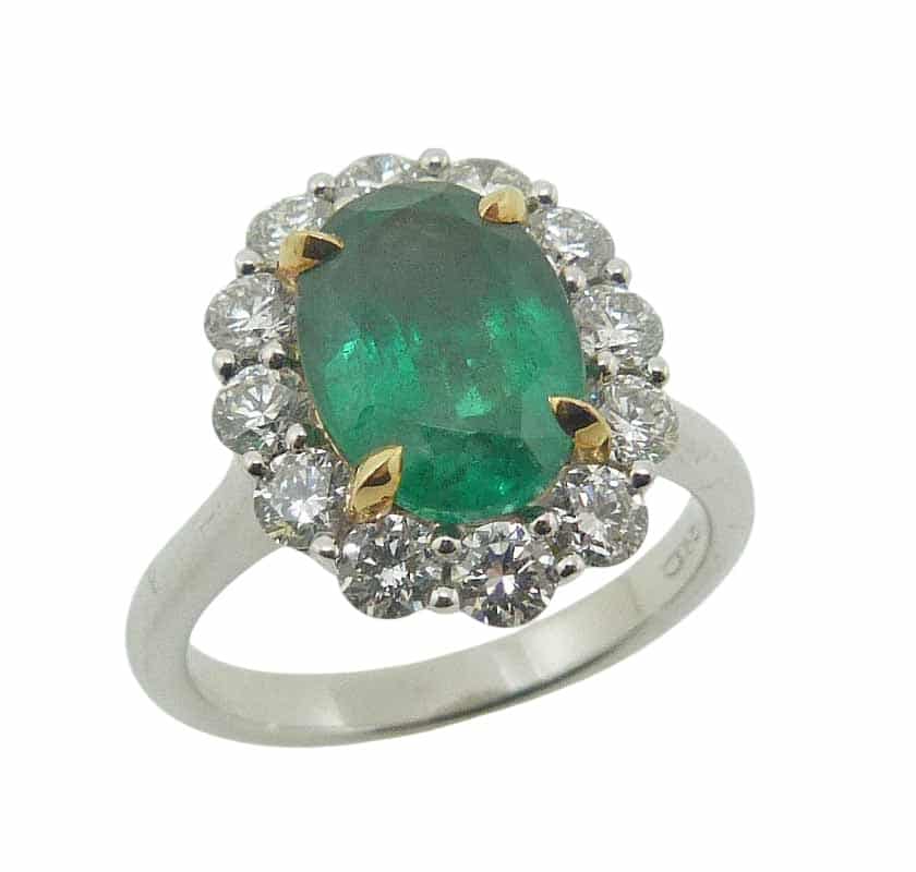 14K White and yellow gold cluster halo lady’s ring claw set with an oval emerald, 2.48 carat, and accented in the halo and profile with twenty-eight round brilliant cut diamonds, 1.00 total carat weight.