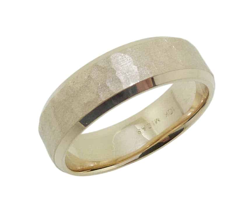 10K Yellow gold beveled edge men’s 6.5mm band with hammered stainless centre and polished edges.