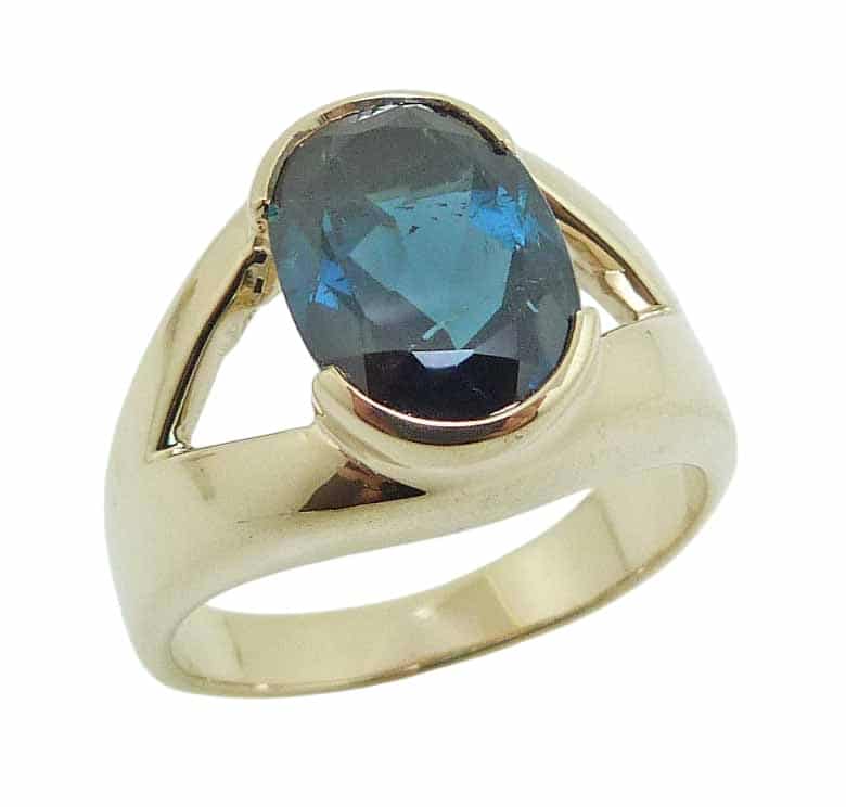 14K Yellow gold lady’s ring semi-bezel set with 3.51 carat indicolite blue tourmaline.