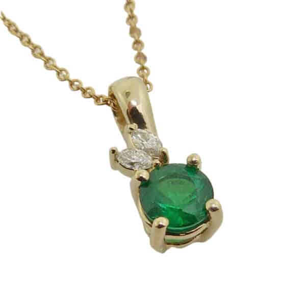 14K Yellow gold pendant set with one 0.557 carat round emerald and two marquis shaped diamonds totaling 0.073 carats, SI1, G/H.