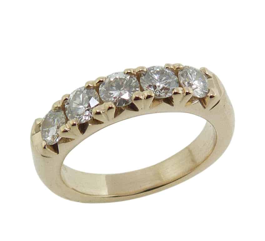 14K Yellow gold diamond lady’s band claw set with five natural round brilliant cut diamonds, 0.983 total carat weight, G/H, SI1-2.