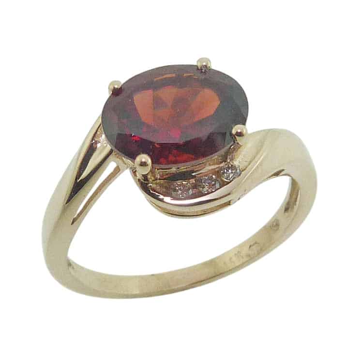 14K Yellow gold ring claw set with a 2.28 carat oval garnet and accented with six pave set, natural round brilliant diamonds, totaling 0.86 carat, H, SI1.