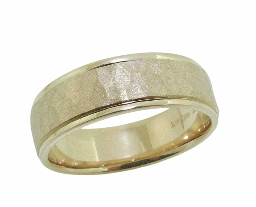10K Yellow gold wedding band with hammered satin finished center and rounded polished borders.