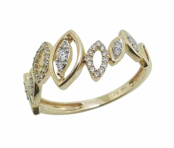 14K Yellow gold open marquise diamond band pave set with thirty-five round brilliant cut diamonds, 0.14 total carat weight.
