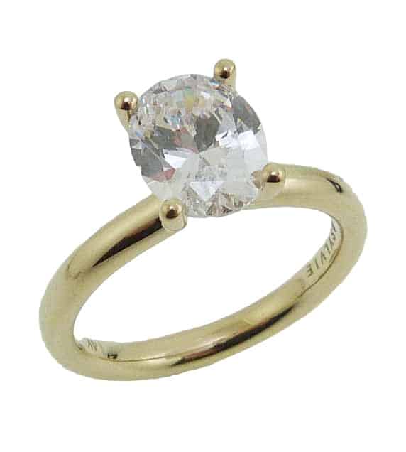 14K Yellow gold Sylvie oval solitaire engagement ring claw set in the centre with a 2.50 carat oval CZ.