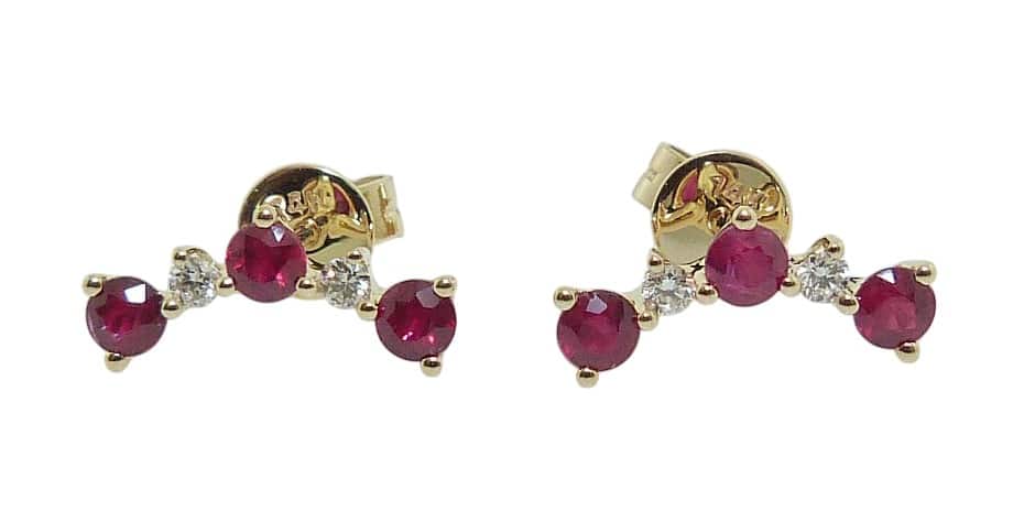 14K Yellow gold arched stud earrings claw set with six rubies, 0.57 total carat weight and four round brilliant cut diamonds, 0.09 total carat weight.