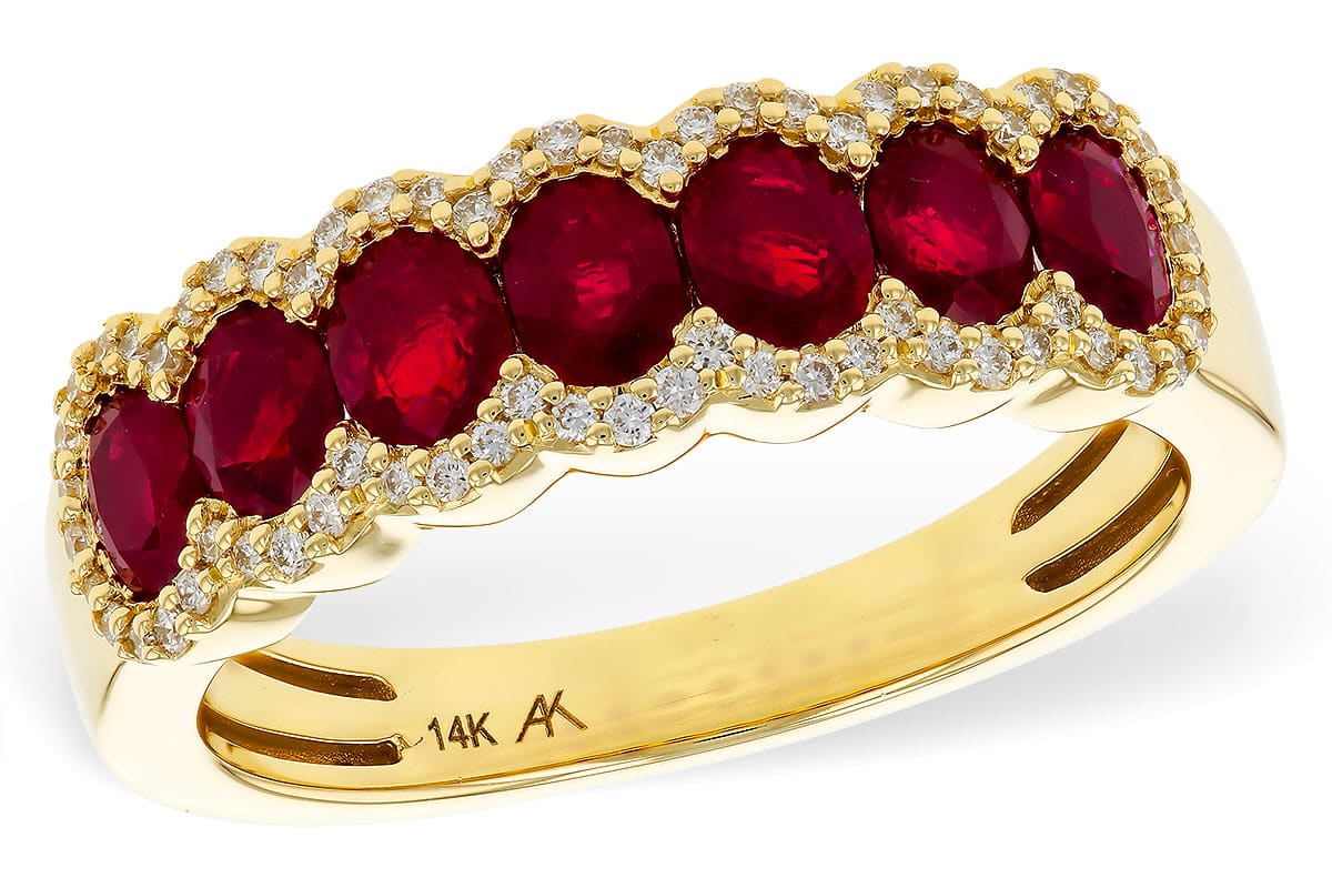 14K Yellow gold bezel halo seven oval ruby lady’s band, 1.40 total carat weight, accented with round brilliant cut natural diamonds, 0.17 total carat weight, G/H, SI1+.