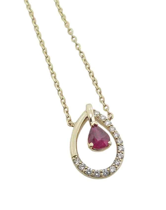14K Yellow gold open halo necklace claw set with a 0.18 carat pear shape ruby and accented with fifteen round brilliant cut diamonds in the halo, 0.08 total carat weight.