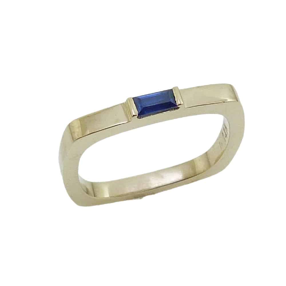 14K yellow gold square shank ring set with 0.16ct baguette blue sapphire.