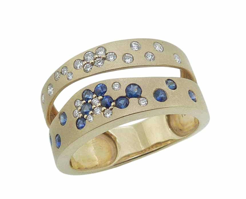 14K Yellow gold satin and polished finish sapphire and diamond band flush set with twenty-five round brilliant cut diamonds, 0.23 total carat weight, and thirteen blue sapphires, 0.31 total carat weight.