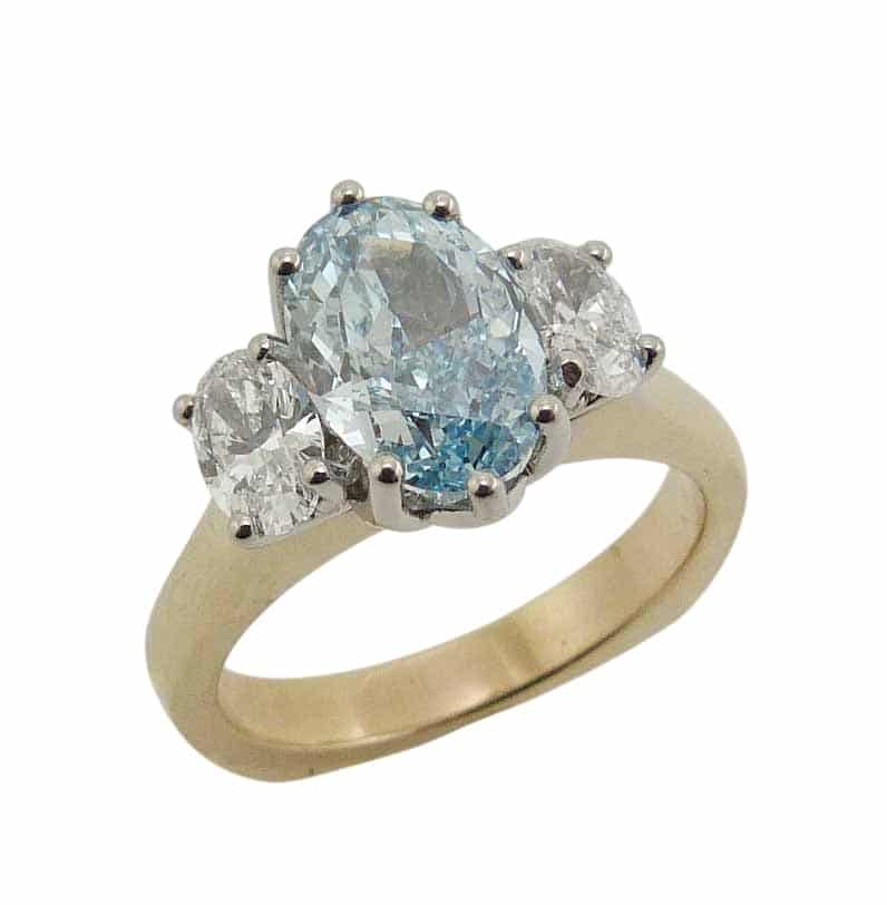 14K Yellow and white gold custom three stone engagement ring claw set in the center with one fancy vivid blue oval modified brilliant lab grown diamond, 2.06 carat, VS1. Accented on the side with two claw set oval brilliant cut lab grown diamonds, totaling 0.65 carats, F/G, VS1-2.