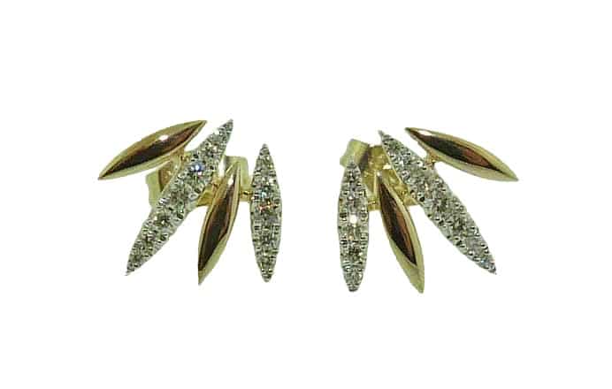 14K Yellow & white gold diamond floral flare earrings claw set with twenty-four round brilliant cut diamonds, totaling 0.19 carats.